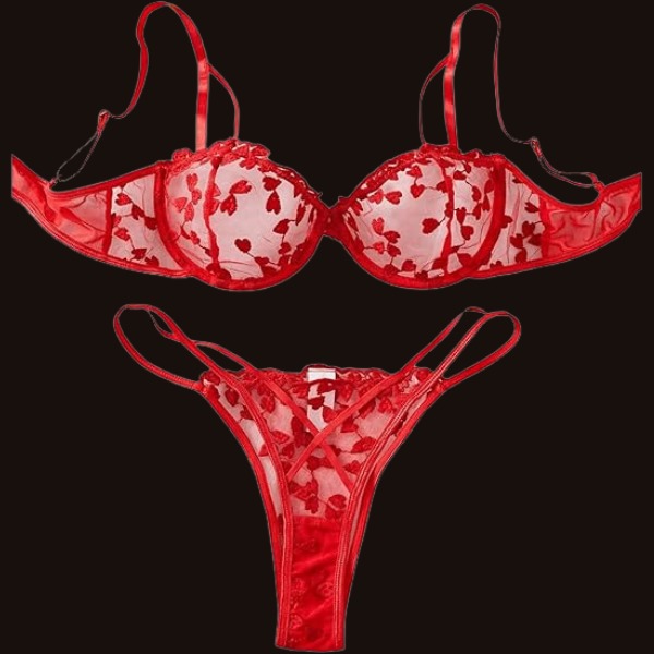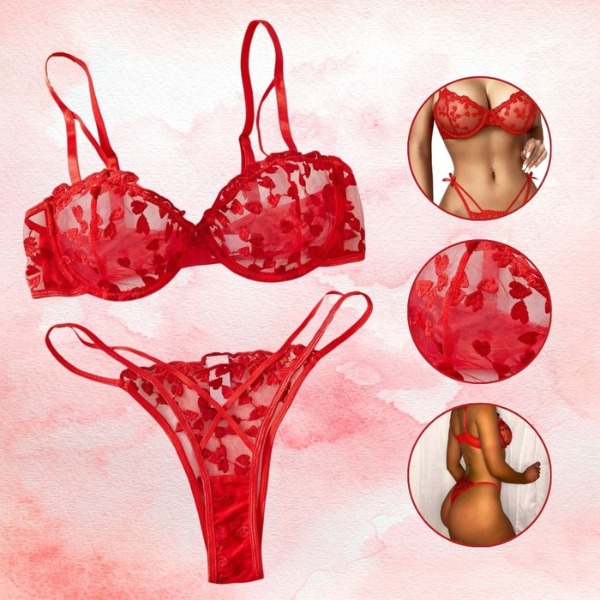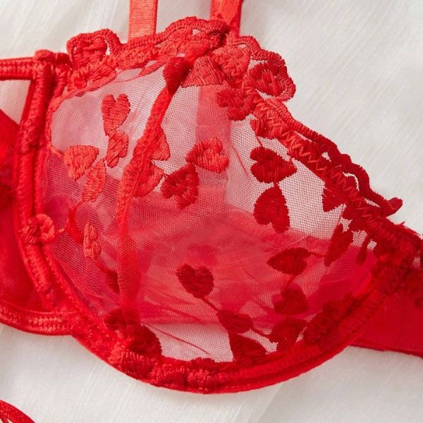 Ten czerwony komplet bielizny to idealny wybór na Walentynki! Dzięki misternemu haftowi w kształcie serca i delikatnym detalom z przezroczystej siateczki ten zestaw ma podkreślić Twój romantyczny urok.