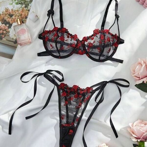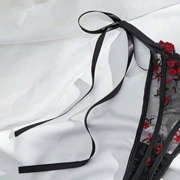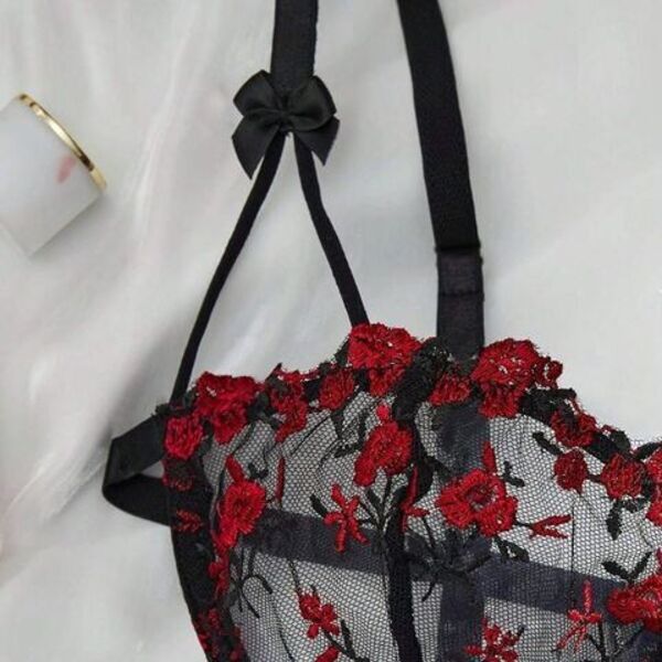 Poczuj urok seksownego haftu kwiatowego na przezroczystym materiale, dodając odrobinę kobiecości i elegancji swoim intymnym ubraniom.