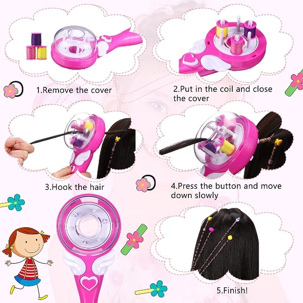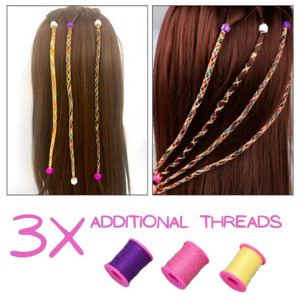 - Zawartość opakowania: 1x maszyna do zaplatania włosów, 12x spinek do włosów, 3x nici (nić żółta, różowa i fioletowa), 2x akcesoria ułatwiające użytkowanie.